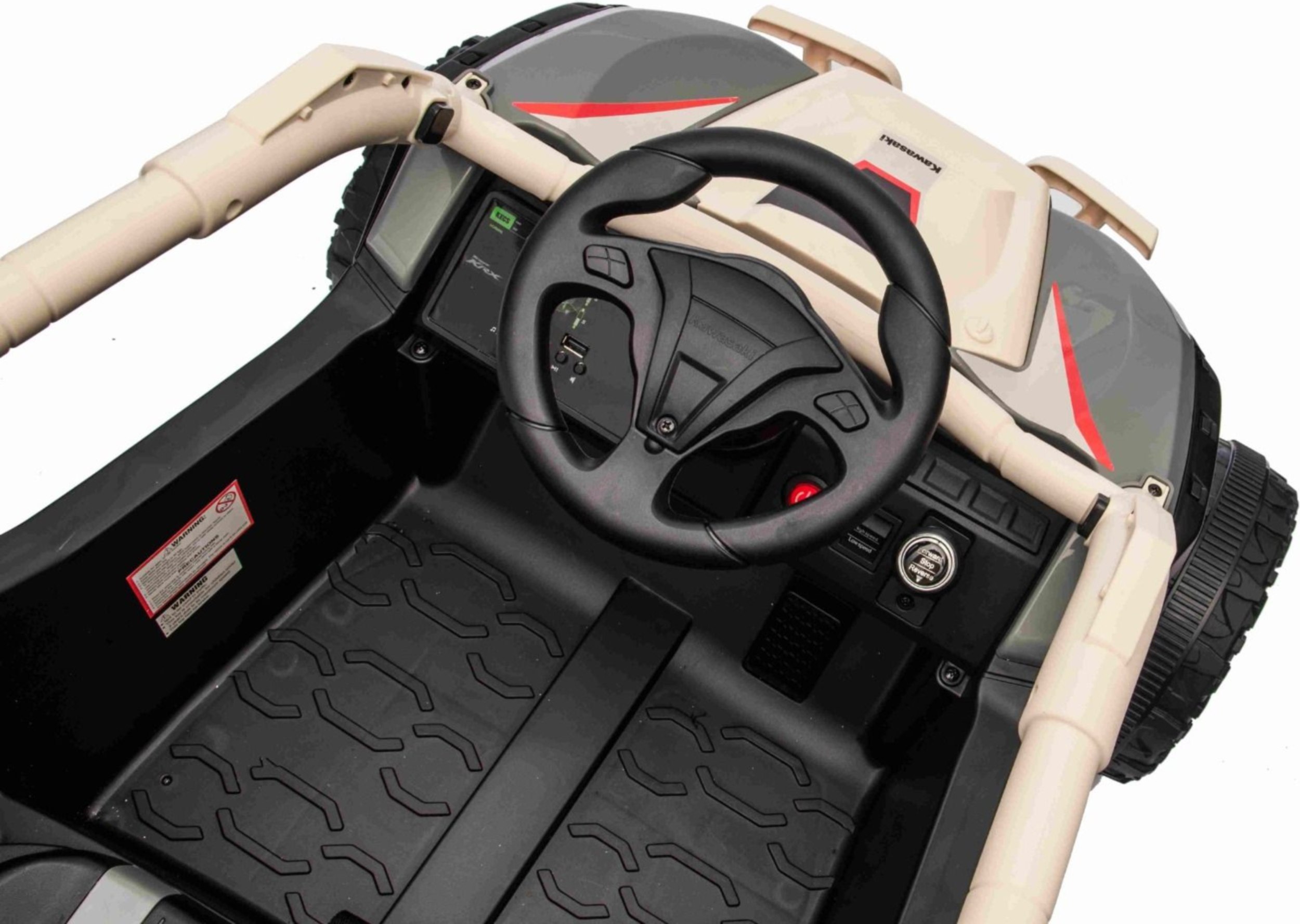 Srce vozila je 11V 4Ah Lithium baterija. Ta tip baterije je lažji, se hitreje polni in omogoča daljšo življenjsko dobo kot standardne baterije. Vaš Kawasaki bo tako vedno pripravljen na akcijo, z dvema 25W motorjema pa bo z lahkoto premagoval domače dvorišče.
