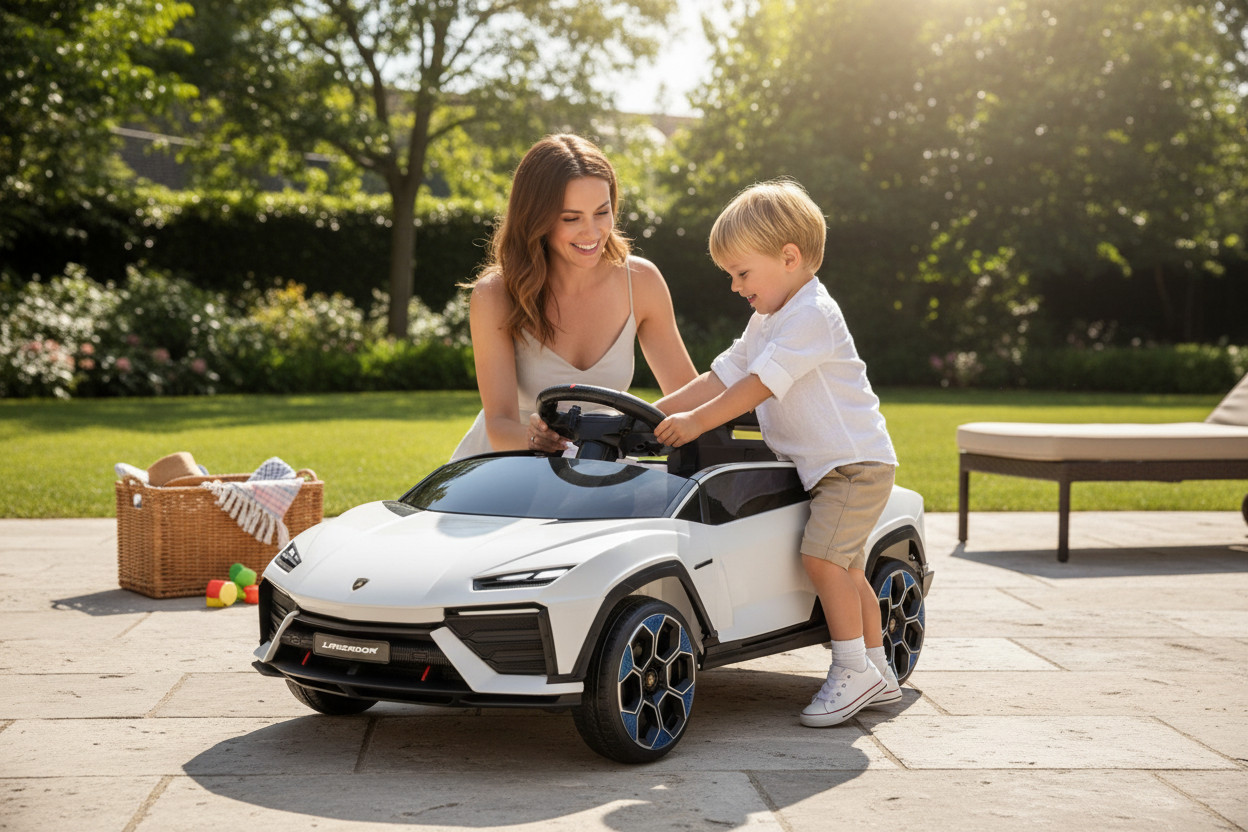 Futurističen dizajn Lamborghini z realističnimi svetlobnimi in zvočnimi učinki ter varno vožnjo za mlajše otroke. Vozilo se zažene z gumbom (One Button Start), aktivirajo se luči in glasbene funkcije. Glasbo je mogoče predvajati prek USB, AUX ali Bluetooth. Stanje baterije je prikazano z indikatorjem napolnjenosti.