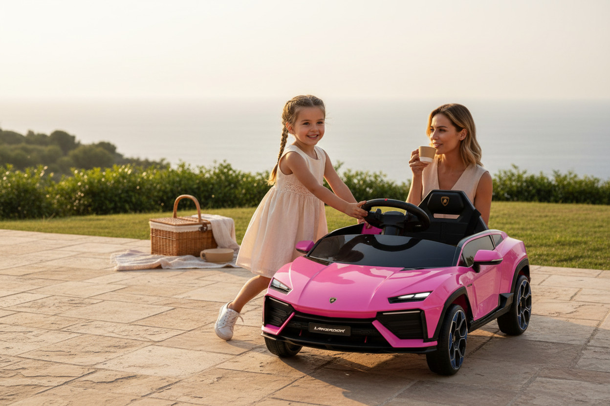 Licencirano otroško vozilo Lamborghini prinaša svetlobne in zvočne učinke ter preprosto upravljanje, prilagojeno mlajšim vozniki. Zagon poteka s pritiskom na gumb (One Button Start), nato pa se vključijo luči in glasbeni modul. Glasbo je mogoče predvajati prek USB, AUX ali Bluetooth povezave, medtem ko indikator jasno prikazuje stanje baterije.