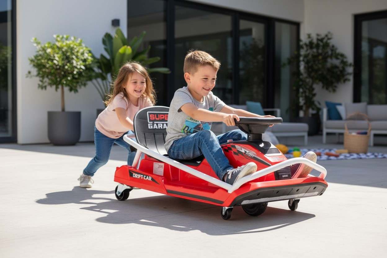 Pripravite se na novo dimenzijo zabave! Ognjeno rdeča barva in neustavljiva moč se združujeta v tem električnem gokartu, ki je pravi drift stroj za male adrenalinske navdušence.